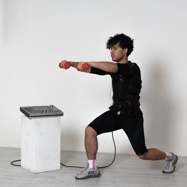 EMS Training, workout, body fitness. Electric muscle stimulation uses controlled electrical impulses to contract muscles, enhancing strength, endurance, recovery, and muscle activation for fitness training.